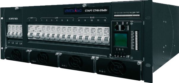 | Индикация на светодиодах и ЖК дисплее | На светодиодах: состояние электросети, системы и выпрямителя; виды аварийных сигнализаций. На ЖК дисплее: состояние системы, аварийные сигнализации, основные входные и выходные параметры. |